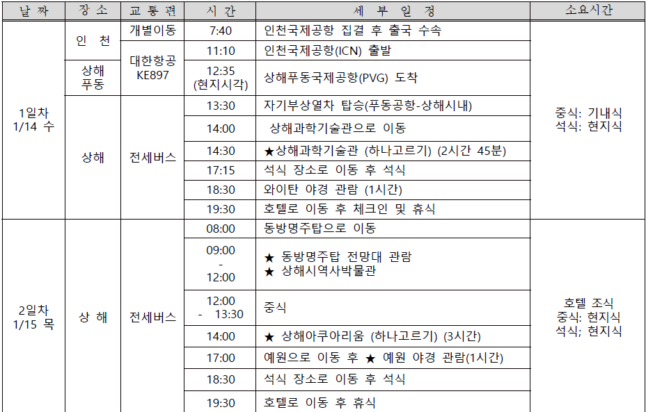 • 출발/도착: 인천공항 출발 1. 14 수요일 오전 11:10 (인천-푸동)